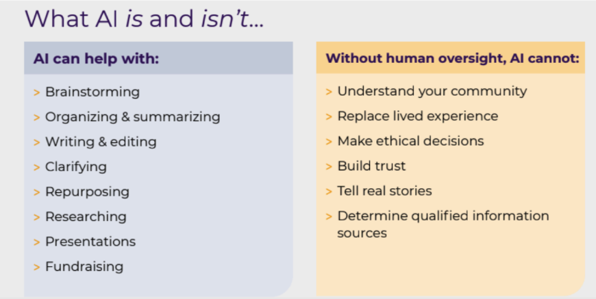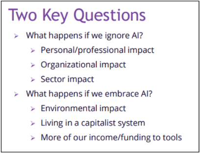 | We are already under-resourced and this would help us create capacity. | I think this is a valid point, but I don’t think that AI literacy OR the product itself is READY in most cases for consumer use. I think AI could potentially help us create capacity if we were WILLING TO GIVE UP certain things. Ideally, we will wait a bit longer and see how the data privacy, corporate transparency, and functionality situations evolve. |